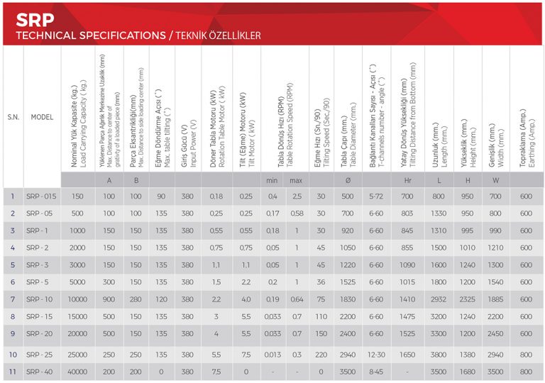 Ürün konstrüksiyon olarak; gövde, motor, tabla döndürme ve eğme sistemleri, elektrik panosu ve uzaktan operatör kontrol ünitesinden oluşmaktadır ve yapısal olarak en iyi korumaya sahiptir. Ağır iş parçaları için pozisyonerler zemine sabitlenmelidirler.