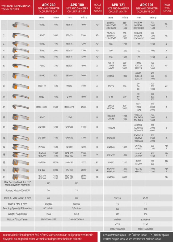 Yan dayamalar, özellikle köşebent ve spiral kıvırma işlemini kolaylaştırmak ve deformasyonu minimuma indirmek için 3 yönde hareketlidir.Bütün bu özellikleri ile APK modelleri rakipleri karşısında daha etkileyici bir seçenek olarak öne çıkıyor.